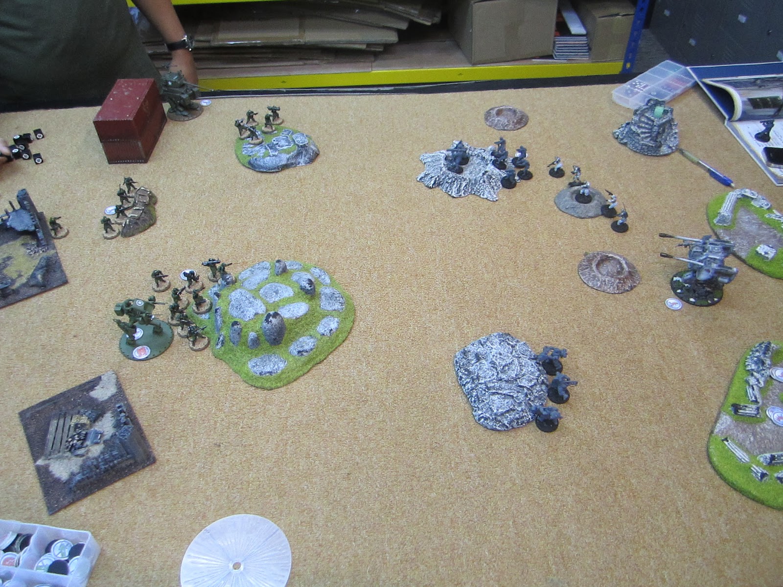 Had our usual game over at PI on Monday (Dust Warfare night) with Abdullah. 150AP aside this time with more terrain as PI brought back the terrain from SPORECON 2012. Using Battle Builder we came up with Key Position and Force Collision.
